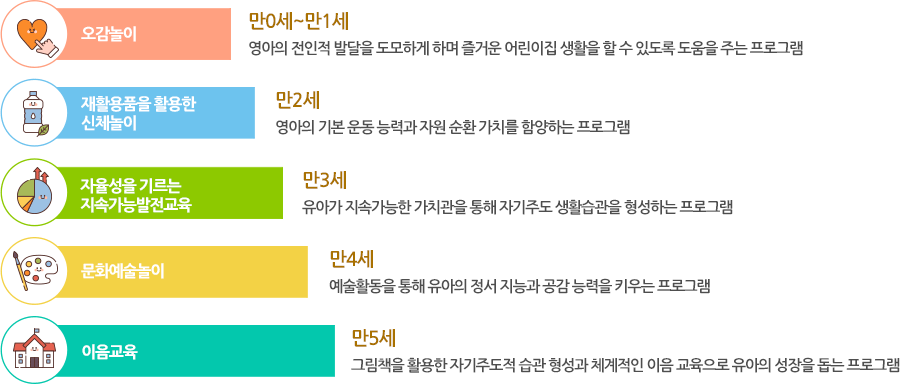영아는 자신의 감각기관을 활용하여 주변 세상을 인식하며 이해하고 적응합니다. 오감을 사용한 직접적인 경험은 영아에게 지적 호기심을 불러일으키고 선행 지식을 풍부하게 해주며, 심적 에너지를 자극하는 촉매제가 되므로 그 교육적 의의는 매우 높습니다. 영아의 시각, 촉각, 후각, 미각, 청각. 오감을 통해 주변을 탐색하고 놀이하는 과정 속에서 발생하는 다양한 경험은 영아의 전인적 발달과 즐거운 어린이집 생활을 할 수 있도록 도움을 줍니다.